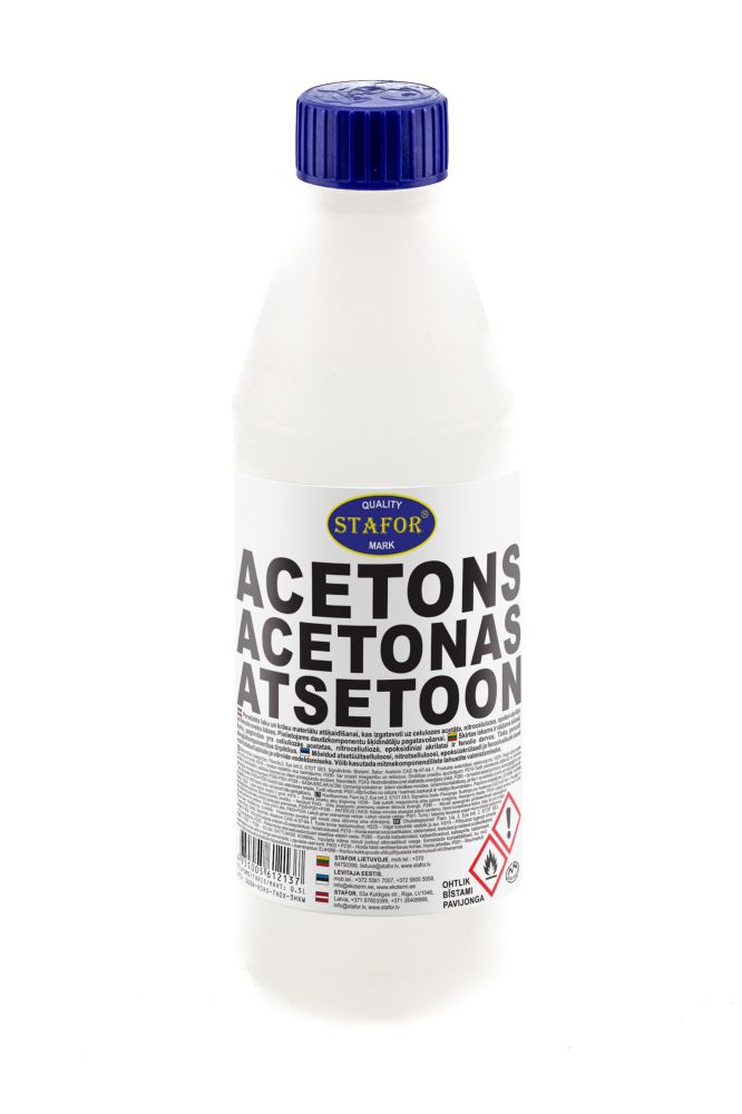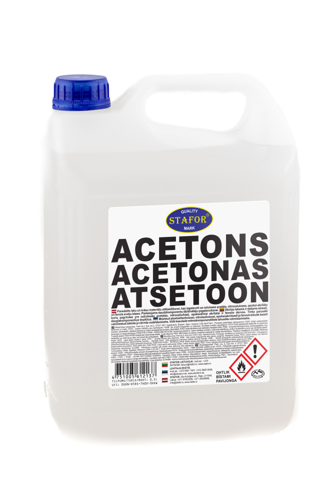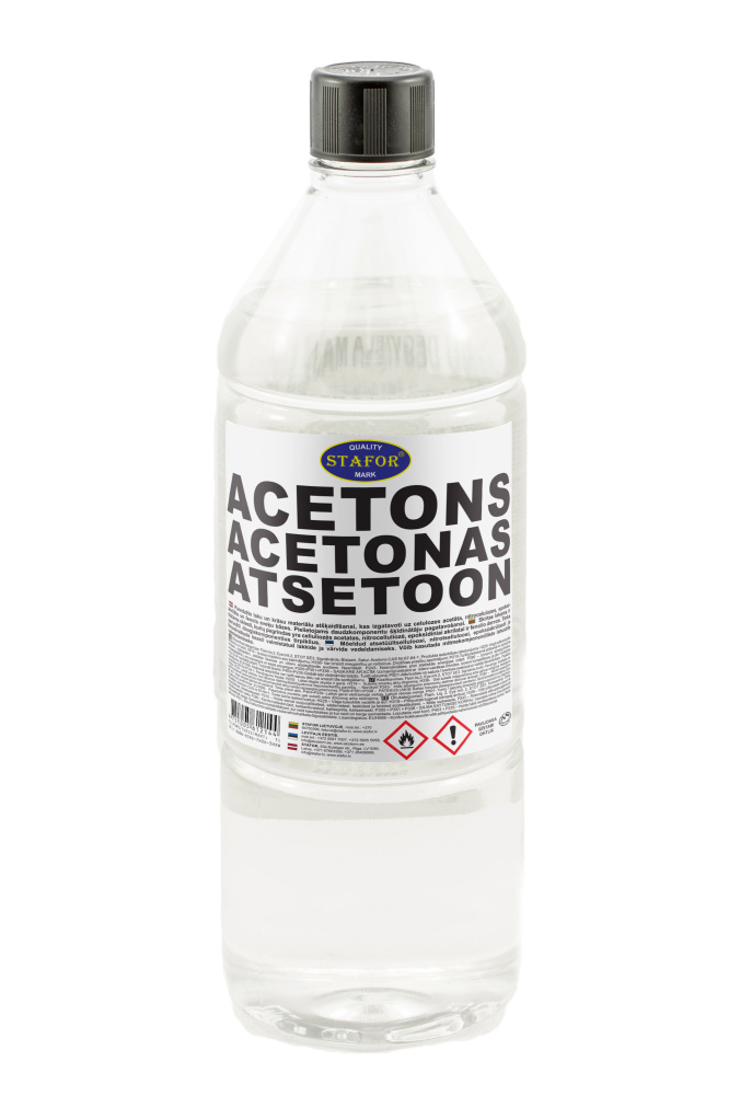 SATUR: Acetons. SIGNĀLVĀRDS: Bīstami. BĪSTAMĪBAS KATEGORIJAS: Uzliesmojošs šķidrums (2. kat.), Acu kairinājumi (2.kat.), Toksiska ietekme uz īpašu mērķorgānu – vienreizēja iedarbība (3. kat.). BĪSTAMĪBAS APZĪMĒJUMI: H225 – Viegli uzliesmojošs šķidrums un tvaiki. H319 – Izraisa nopietnu acu kairinājumu. H336 – var izraisīt miegainību un reiboņus. PAPILDUS BĪSTAMĪBA: EUHO66 – Atkārtota iedarbība var radīt sausu ādu vai izraisīt tās sprēgāšanu. DROŠĪBAS PRASĪBU APZĪMĒJUMI: P403 – Glabāt labi vēdināmā vietā; P210 – Nelietot vietās, kur ir sastopams karstums/dzirksteles/atklāta uguns/karstas virsmas. Nesmēķēt; P280 – Izmantot aizsargdrēbes/acu aizsargus/sejas aizsargus, P305+P351+P338 – SASKARE AR ACĪM: Uzmanīgi skalot ar ūdeni vairākas minūtes. Izņemt kontaktlēcas, ja tās ir ievietotas un ja to var vienkārši izdarīt. Turpināt skalot. P312 – Sazinieties ar SAINDĒŠANĀS CENTRU vai ārstu, ja jums ir slikta dūša, P501 – Atbrīvoties no satura/tvertnes saskaņā ar likumu „Atkritumu apsaimniekošanas likums“, ES direktīvu 91/689/EEK, Komisijas lēmumu (EK) 2000/532 un MK noteikumiem Nr.484. CITI APDRAUDĒJUMI: Personas ar ādas, acu un elpošanas ceļu problēmām var būt jūtīgāki pret vielas iedarbību. Vielai nokļūstot augsnē vai ūdenī, sagaidāma tās biodegradēšanās (iztvaikojot). PUDELE NAV DERĪGA PĀRTIKAS PRODUKTIEM!