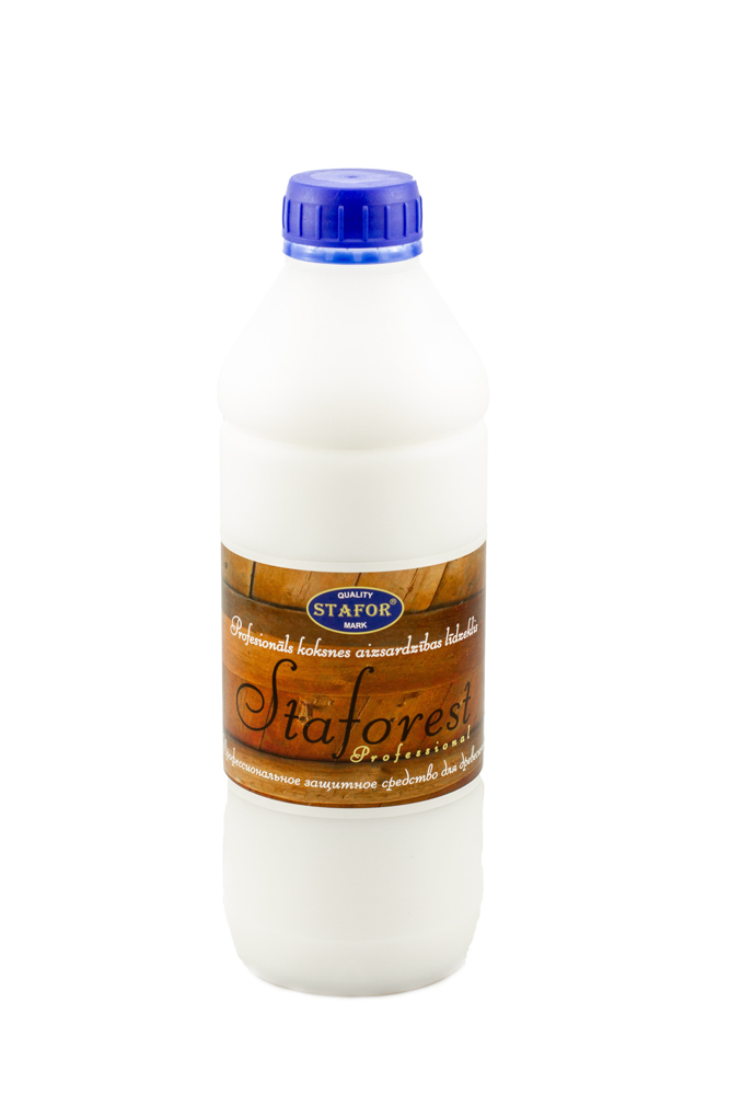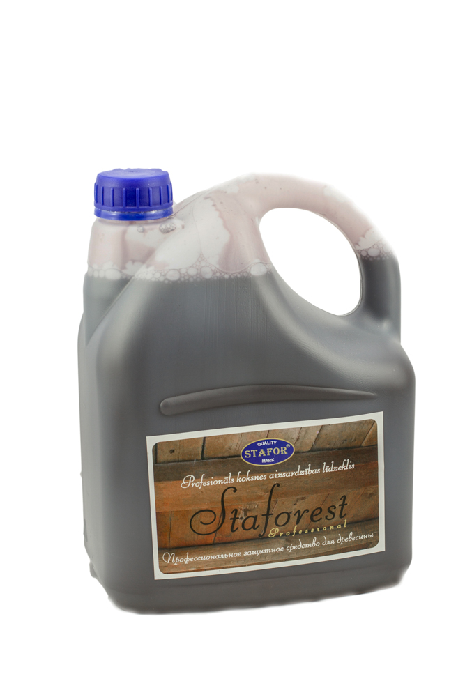 Decorative wood protection agent “STAFOREST PROFESSIONAL” for timber, wooden building materials and constructions protection against environmental adverse effects - putrefaction, mold fungus, harmful micro-organisms and insects both inside and outdoors. Agent is ready for Ready for use and does not require any prior preparing. Agent contains special polymeric additive, therefore it is very resistant against leaching and possible to exploit in wet places. Polymeric additive decreases moisture infiltration and increases the efficiency of the agent.