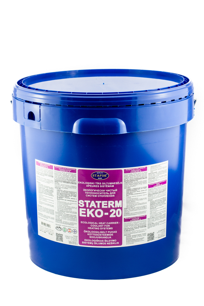 Environmentally friendly coolant for heating systems, contains no harmful to human body ethylene glycol. Made on the basis of non-toxic propylene glycol, and therefore particularly suitable for heating of houses and apartments. Not for use in heating systems with aluminium radiators, STATERM ALUMINIUM EKO-20 is destined for that.